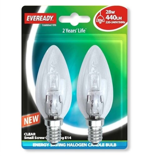 Product Name : Eveready Lighting Candle ECO Halogen 28 Watt (40 Watt) SES/E14 Small Edison Screw Card of 2 EVES4877